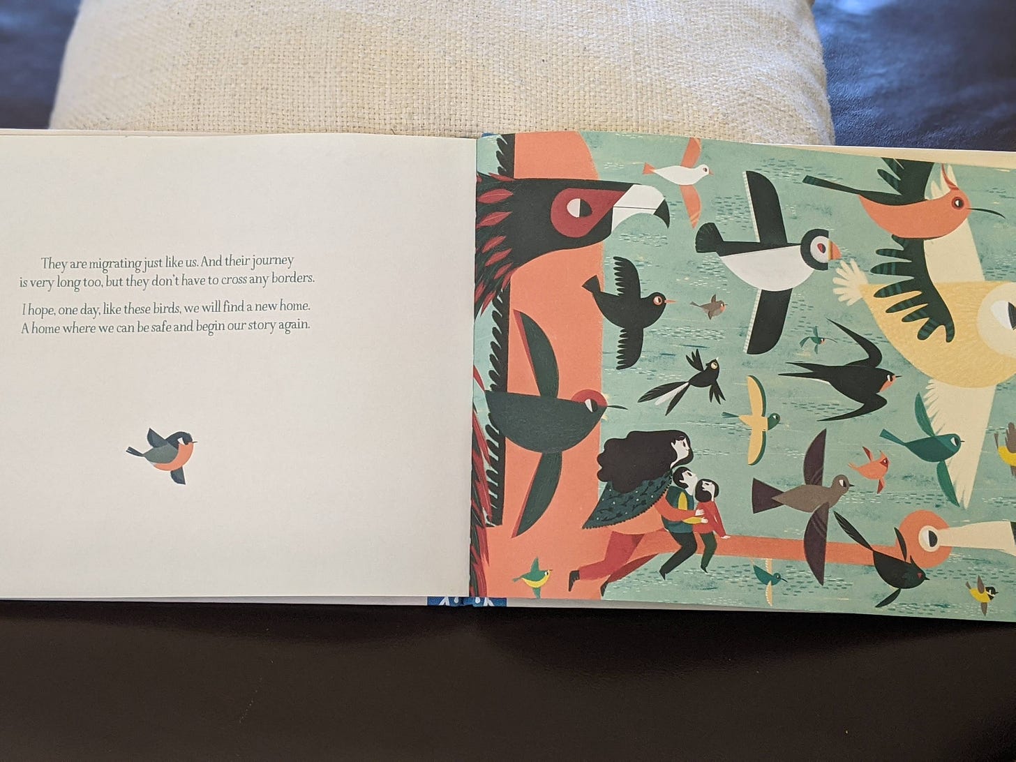 Vulnerability in sharing our emotions: The themes in these stories are often painful, or at the very least leave us adults with a lot of emotions. My kids have seen me cry in response to a story. When we can show our own feelings and the things we care about, we show our children they are safe to do so as well. They offer conversations about a range and complexity of emotions – that the little girl was probably feeling sad, scared, and hopeful about leaving her war torn home. We can feel many emotions at once. That the mother was feeling terrified and brave at the same time – grownups get scared, too.